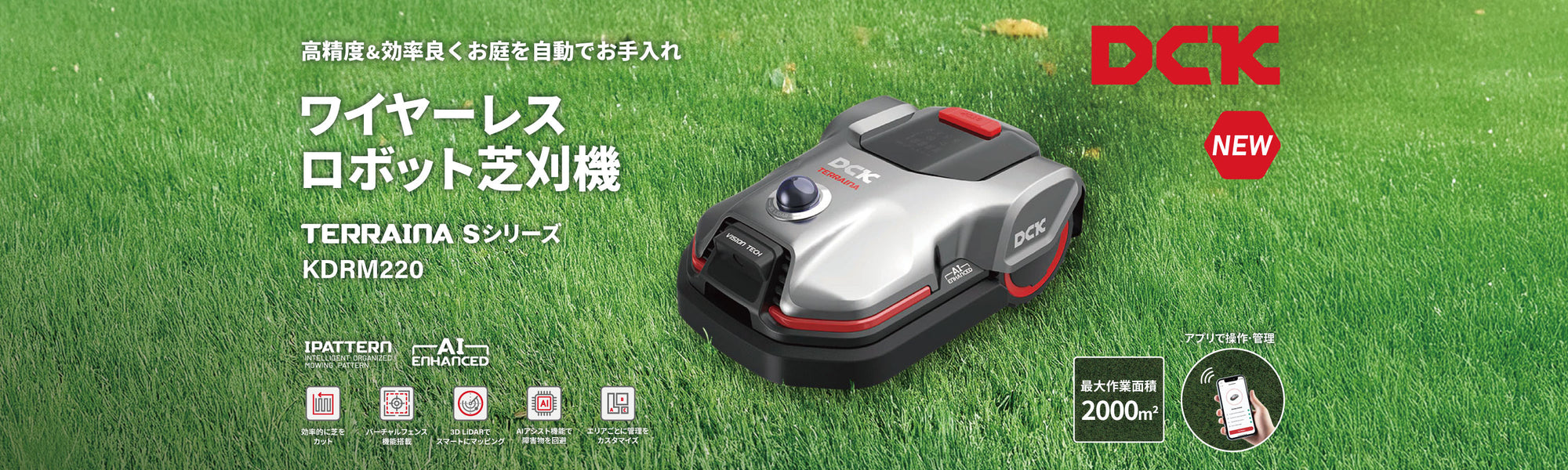 DCKワイヤーレス ロボット芝刈機 境界ワイヤー不要で自由に移動でき、自動で芝を刈り込みます。手間をかけずに効率的な芝生管理が可能です。 3D LIDAR + vSLAMナビゲーション KDRM220は、3D LiDAR SLAM(自己位置推定と環境地図作成を同時に行う技術)に加え、v...